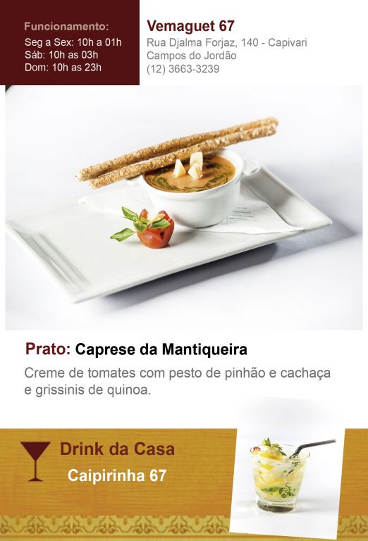O representante de Campos do Jordão nesta edição é o restaurante Vemaguet 67. A casa, localizada no Capivari, idealizou para este ano o Caprese da Mantiqueira. Um creme de tomates com pesto de pinhão e cachaça e grissinis de quinoa. Para beber, a Caipirinha 67.