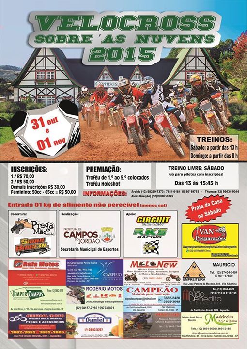 Campos do Jordão irá receber entre os dias 31 de outubro e 1º de novembro uma prova de motocross na pista Sobre as Nuvens. O evento será realizado no sábado a partir das 13h e no domingo a partir das 8h.
