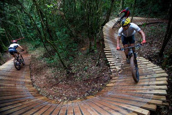 Trilhas para as modalidades All Mountain e XC e destaques como curvas em paredes de madeira, terra e pequenos saltos.