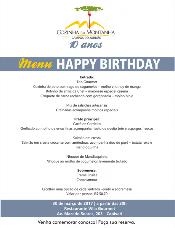 No mesmo local, a partir das 20h, um jantar super especial elaborado pela chef Michelle Peretti do Villa Gourmet, denominado Menu Happy Birthday. Faça sua reserva!